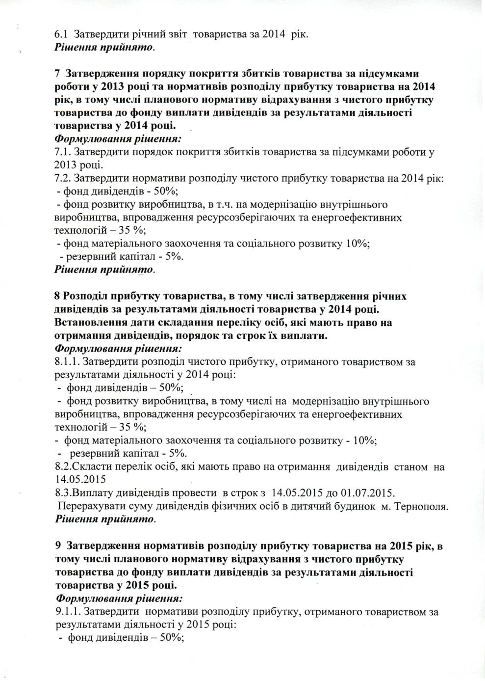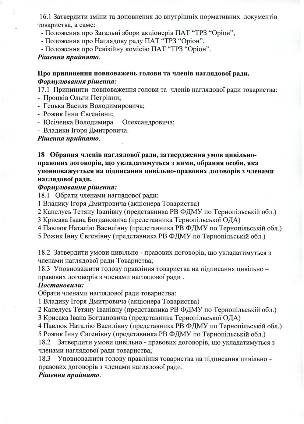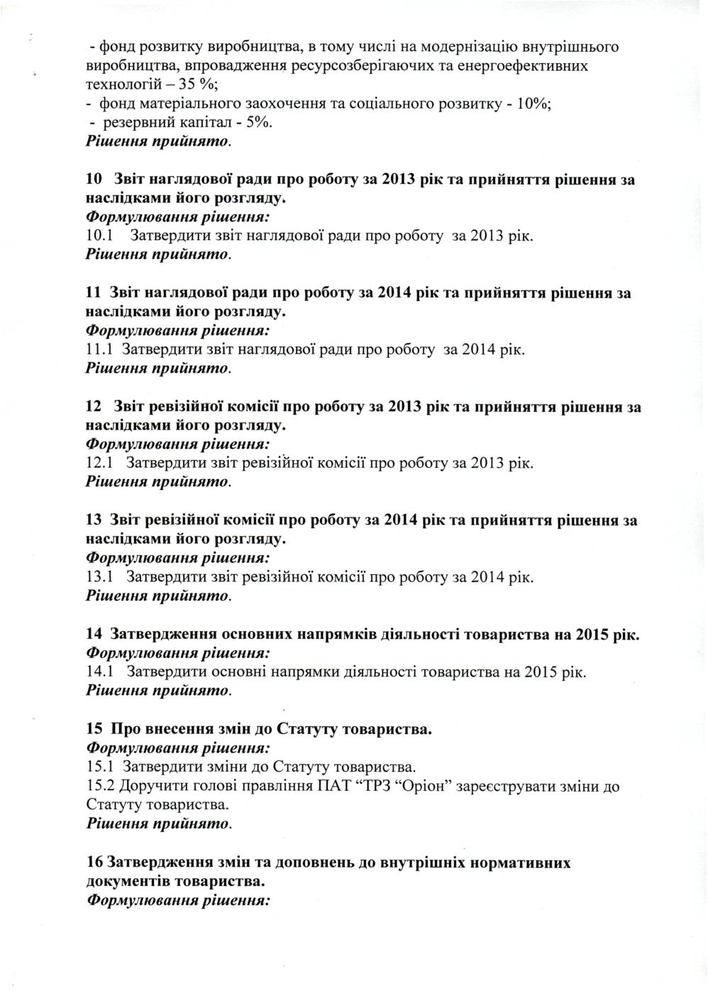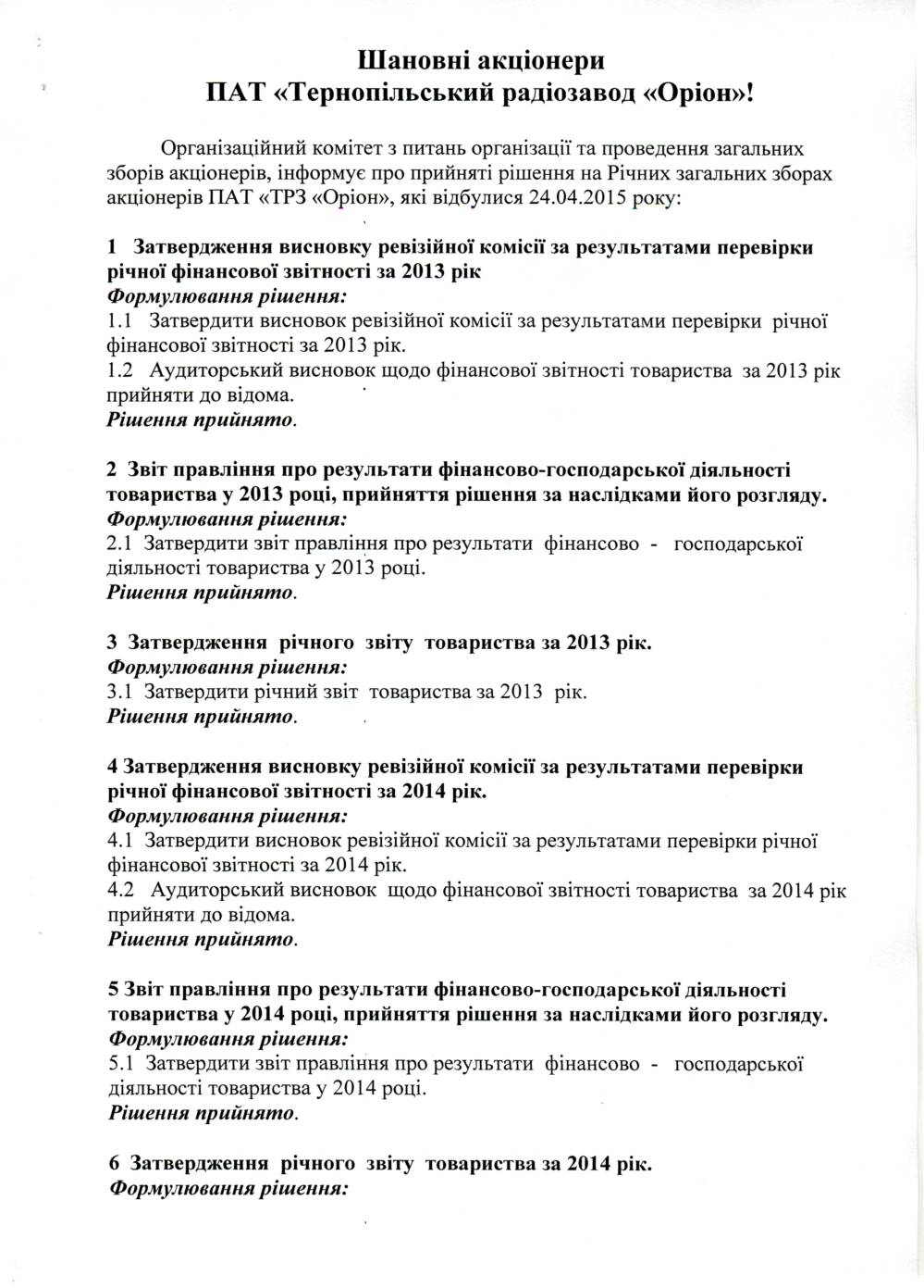 Організаційний комітет з питань організації та проведення загальних річних зборів акціонерів, інформує про прийняті рішення на Річних загальних зборах акціонерів ПАТ "ТРЗ "Оріон", які відбулися 24.04.2015 року.